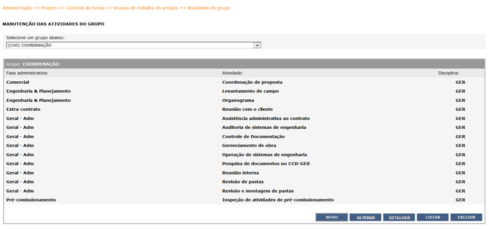 Cadastro simples das atividades default de cada grupo a fim de facilitar o lançamento das horas trabalhadas no módulo de Controle de Horas (RDA).