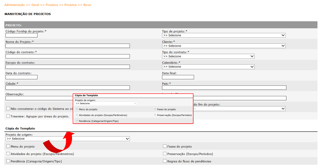 Através desse recurso, novos projetos podem ser criados usando um projeto modelo como origem, ou seja, Menu do Projeto, Fases do Projeto, Atividades do Projeto (Escopo/Parâmetros), Preservação (Escopo/Períodos), Pendências (Categoria/Origem/Tipo) e Regras do Fluxo de Pendências. Todas as configurações do projeto de origem serão copiadas para o novo projeto.