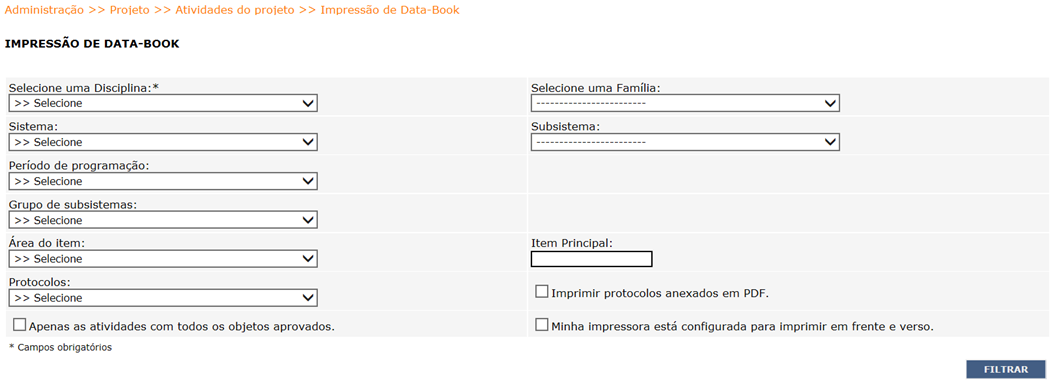 Esse recurso permite que o usuário execute a impressão dos protocolos em lote, com ou sem registros, ou seja, por disciplina (campo obrigatório), família, sistema, subsistema das atividades associadas Caso o usuário precise imprimir somente os protocolos aprovados, será necessário marcar a opção Apenas as atividades com todos os objetos aprovados.