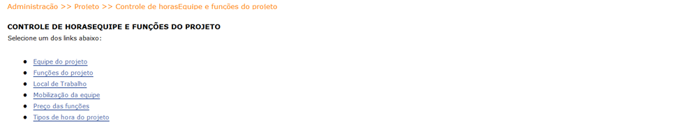 Tela do menu Administração à Projeto à Controle de Horas à Equipe e Funções de Projeto