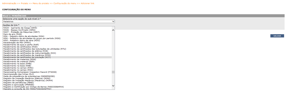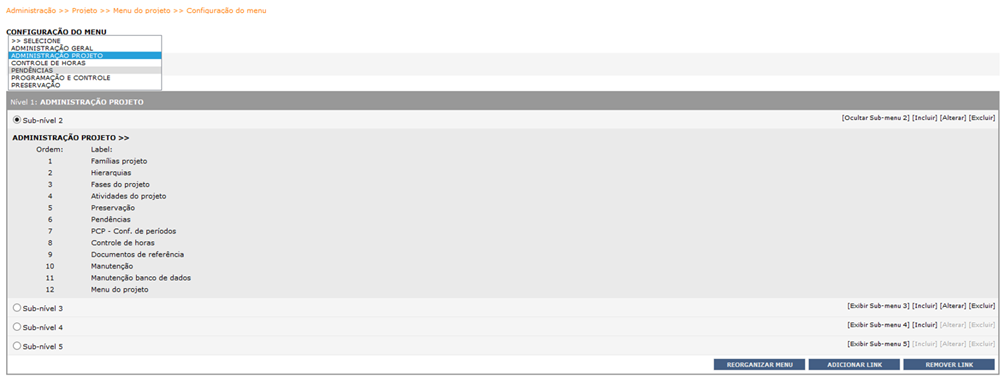 Tela de manutenção dos links no subnível 3 do menu Administração à Projeto