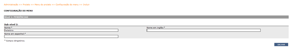 Tela de inclusão de uma nova opção de subnível 2 para o menu Relatórios