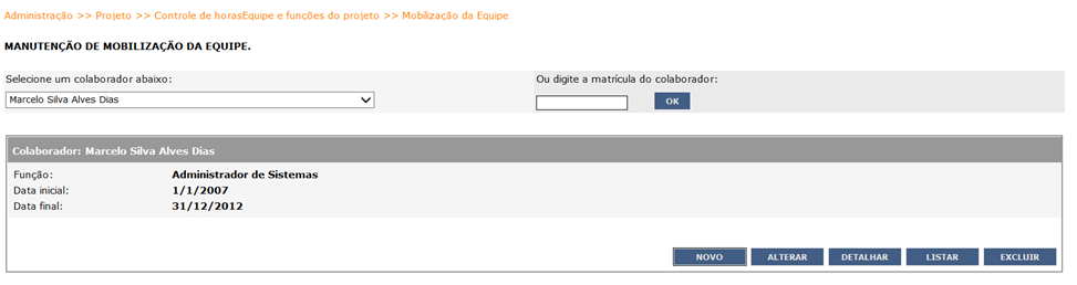 Cadastro simples das datas de entrada e de saída de cada colaborador no projeto e também das funções assumidas.