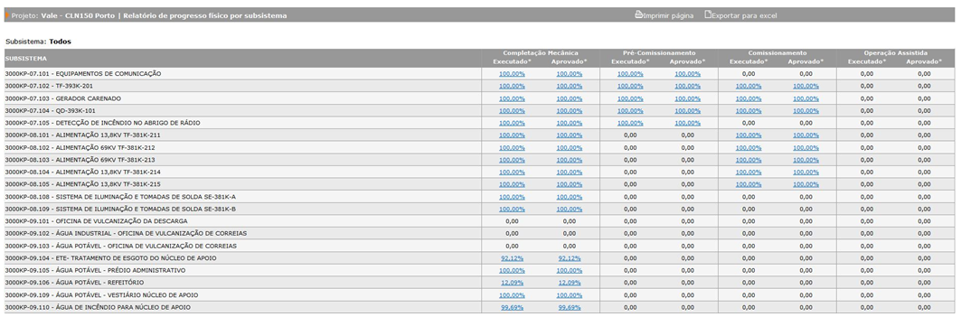 A tela a seguir apresenta o relatório completo dos objetos executados e aprovados de todos os subsistemas, das fases de pré-comissionamento e de comissionamento.