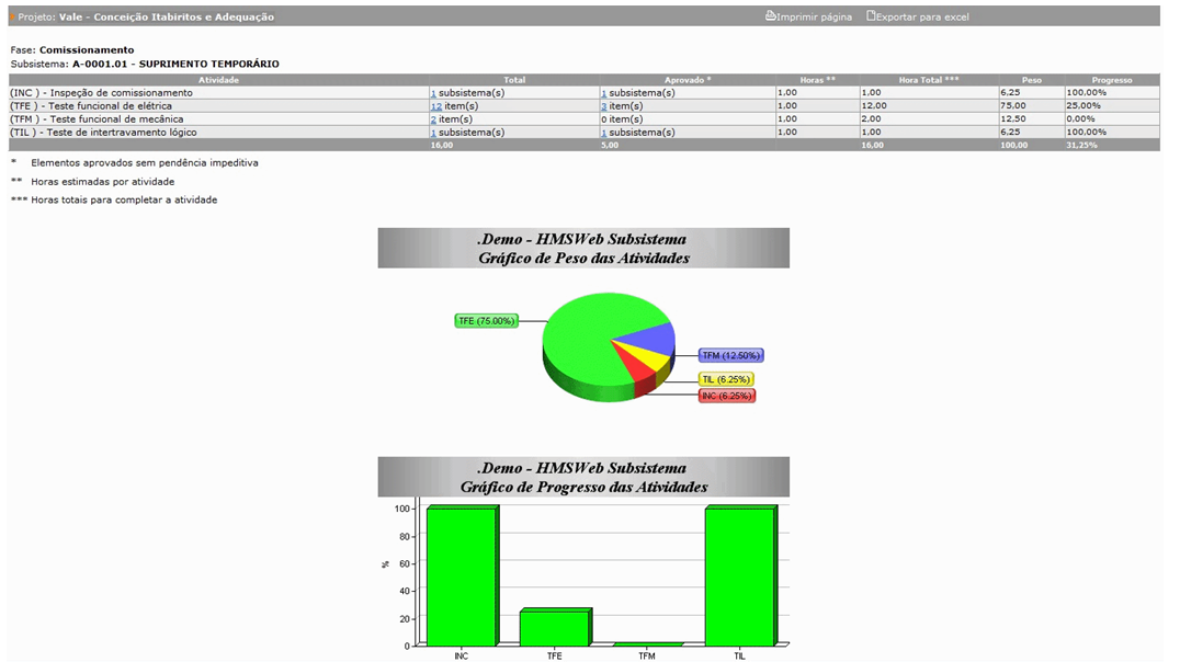 A tela a seguir apresenta cada atividade da fase selecionada e os gráficos de progresso para o subsistema em questão. Essa tela também apresenta os links que geram listas dos objetos, contendo links para gerar folhas de registro.