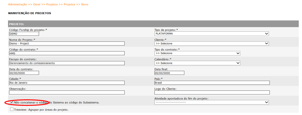 A opção Não concatenar o código do sistema ao código do subsistema, na tela de inclusão de um novo projeto, permite o cadastro do subsistema sem a concatenação com o código do sistema. Essa opção não poderá ser modificada se for selecionada para um sistema e subsistema já incluído.