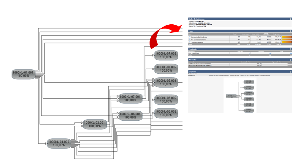 No HMSWeb é representada pelo diagrama de blocos, informando o percentual de conclusão de comissionamento por subsistema para dar ínicio a operação conforme sequência lógica.