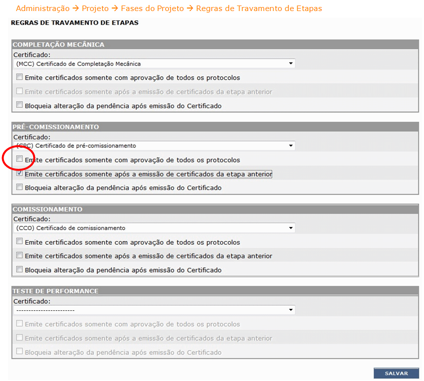 Essa funcionalidade permite definir três regras de travamento e de alarme para emissão dos certificados de cada etapa do projeto.