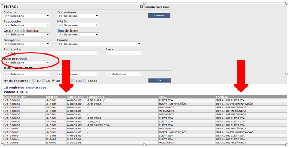 Na tela para listar itens, através da opção de filtro por Item Principal. Esse filtro permite a consulta apenas dos subitens vinculados ao item principal selecionado.